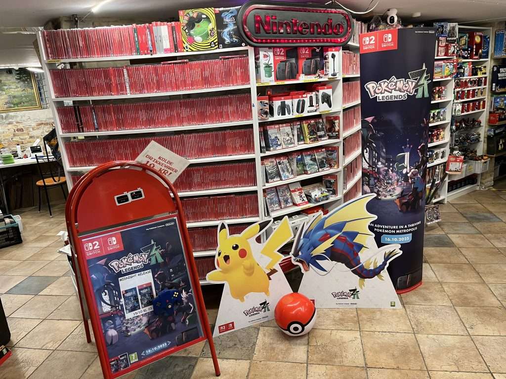 Nintendopusheren er først og fremmest en fysisk butik, hvor vi sælger videospil og konsoller. Udvalget strækker sig fra de første konsoller fra 80erne og helt frem til den nyeste Playstation 5 og Nintendos Switch 2.