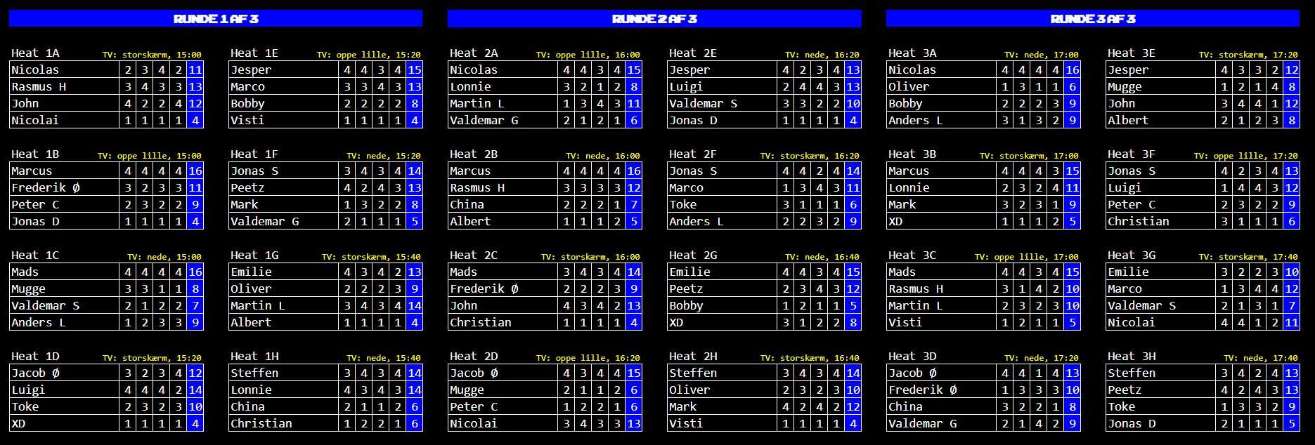 I 2025 ændrede vi formatet så alle deltagere spiller tre heats som indledende runde, hvor der samles point sammen. De 16 bedste spiller kvartfinaler, semifinaler og finale. Selvom tilmelding ikke er nødvendig før på dagen, kan man forbedre sine chancer ved at sende en kvalifikationstid ind. Læs mere om det længere nede. Vi forventer at de indledende heats tager tre timer at afvikle.