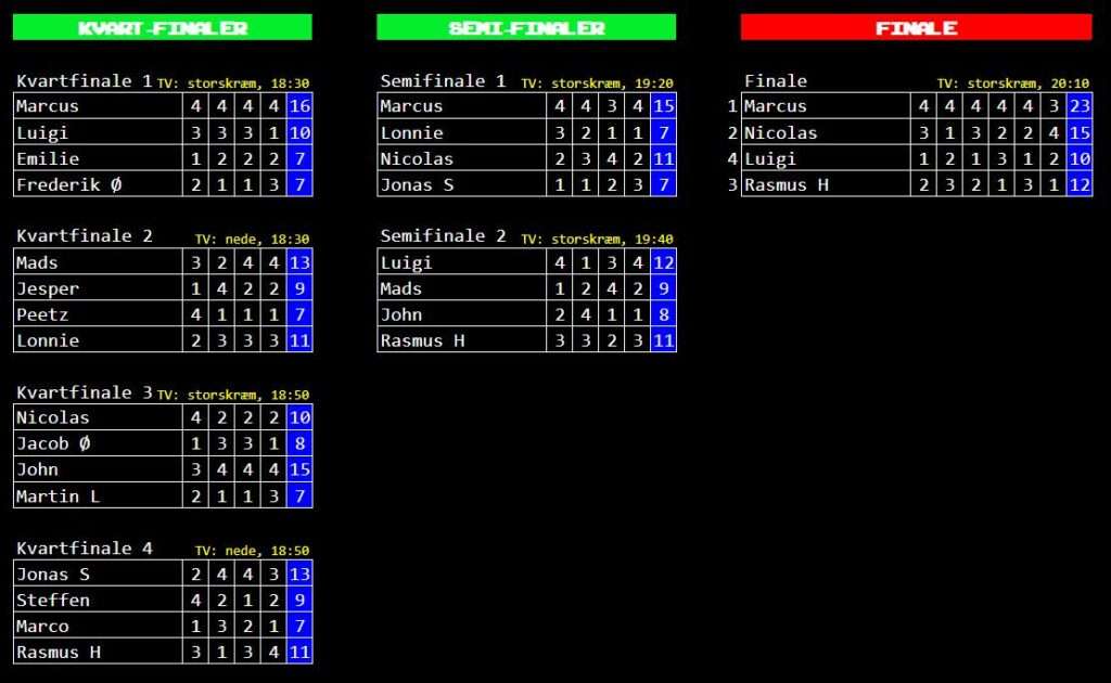 18.00: Eventuelle sudden deaths inden finalerna afgøres inden pause/mad. Vent!