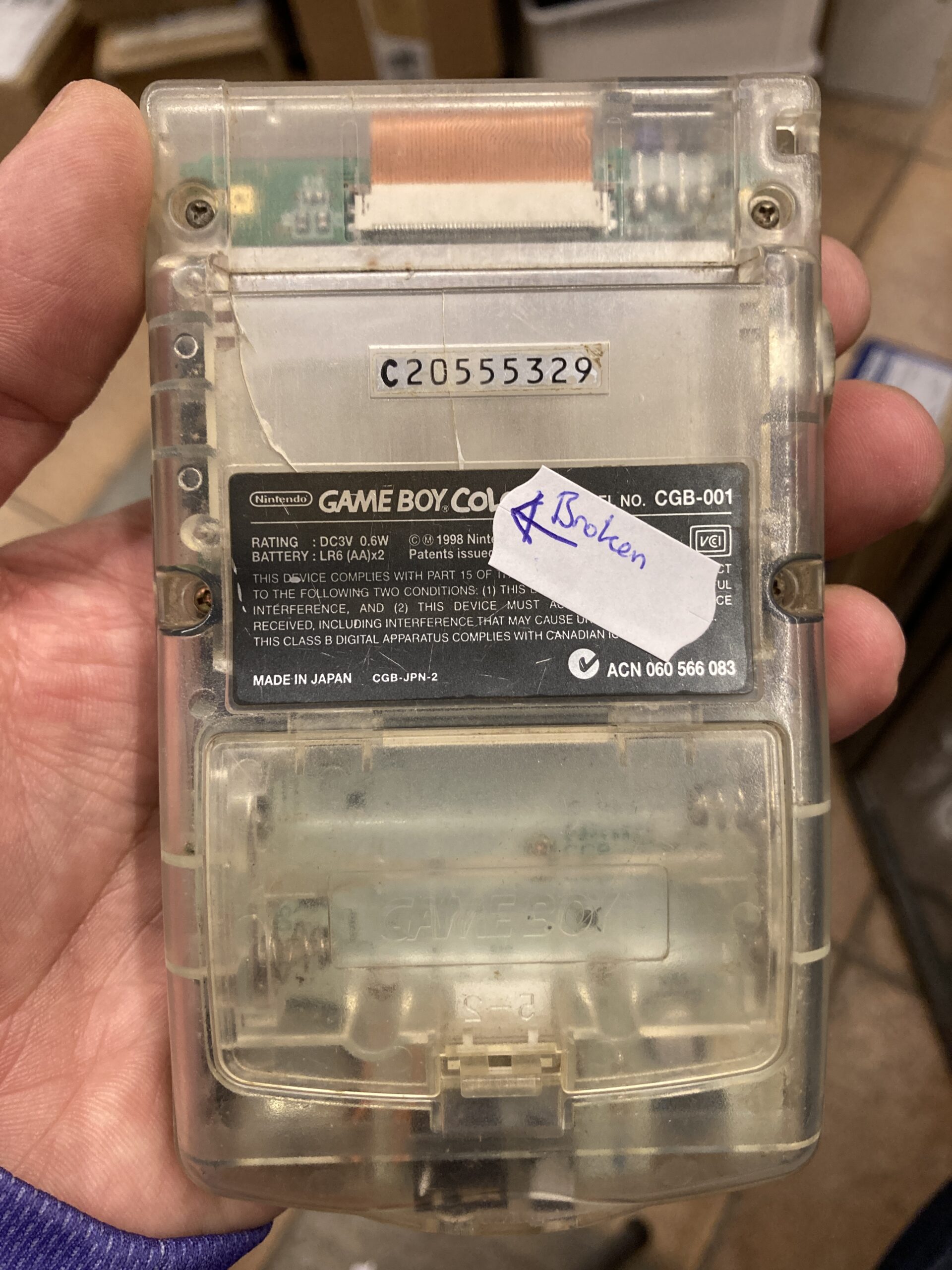 Shell is discoloured and has a bad crack on the rear – screen and bottons are good, damage is cosmetic.