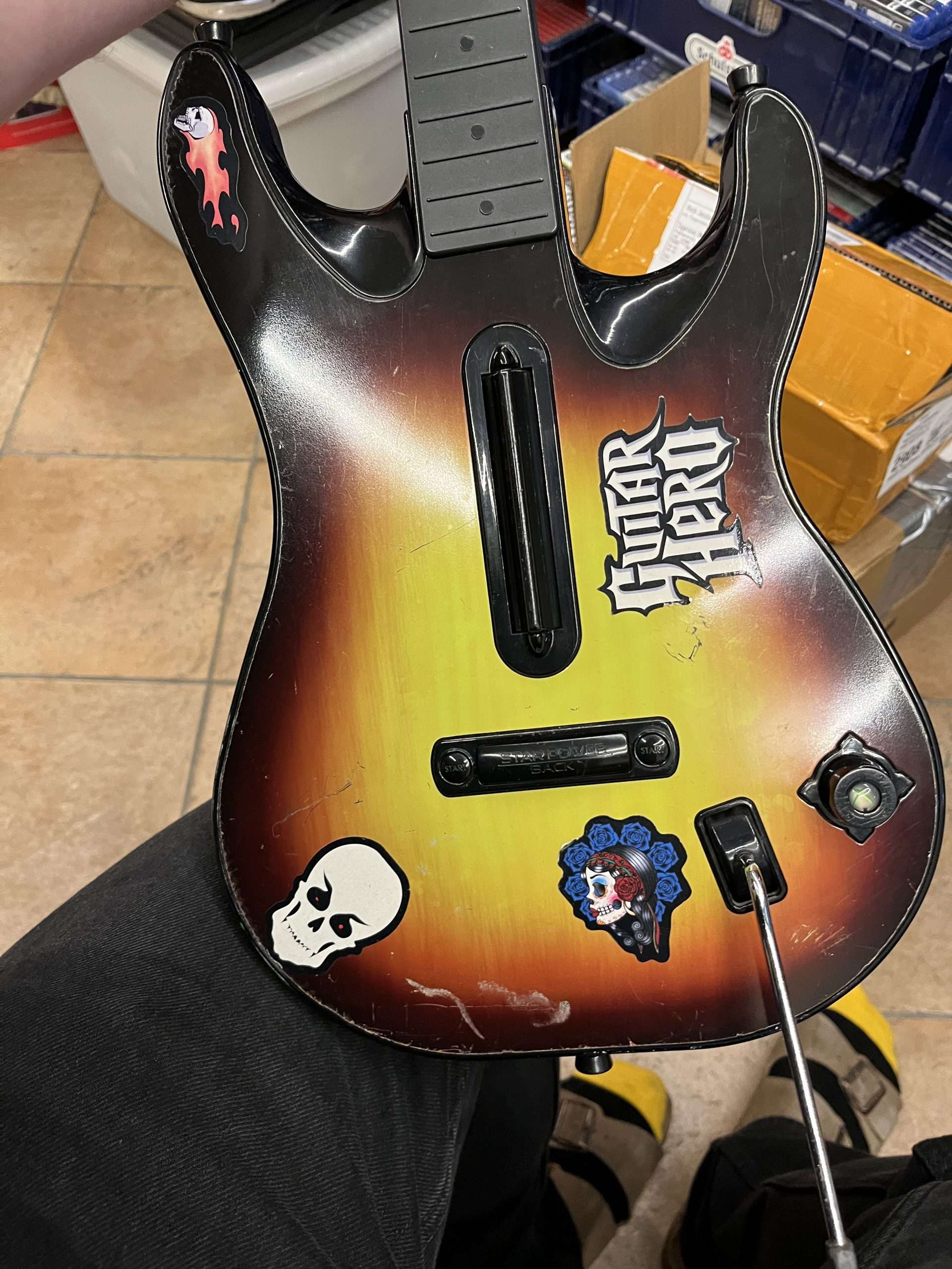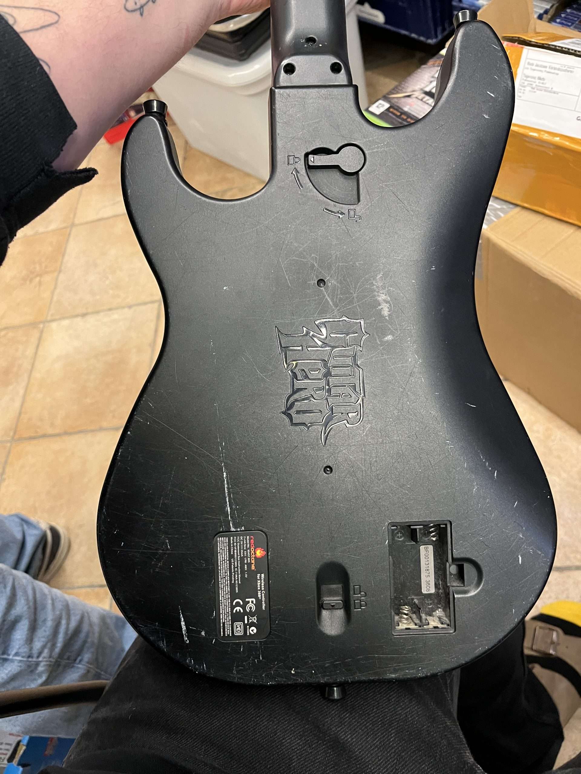 Guitaren er lidt medtaget og mangler batteriklap. Der medfølger seks spil til den.
